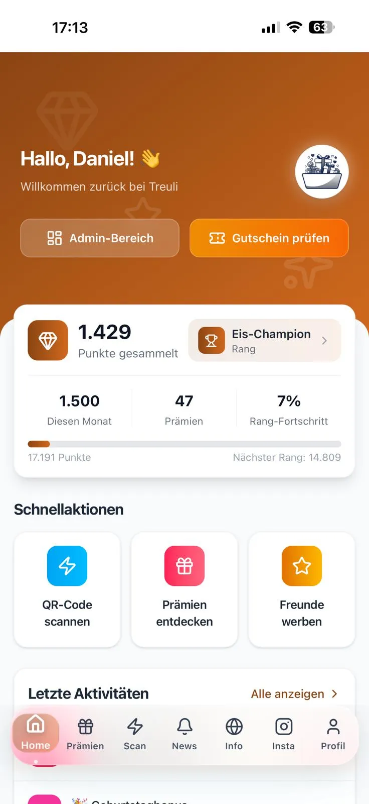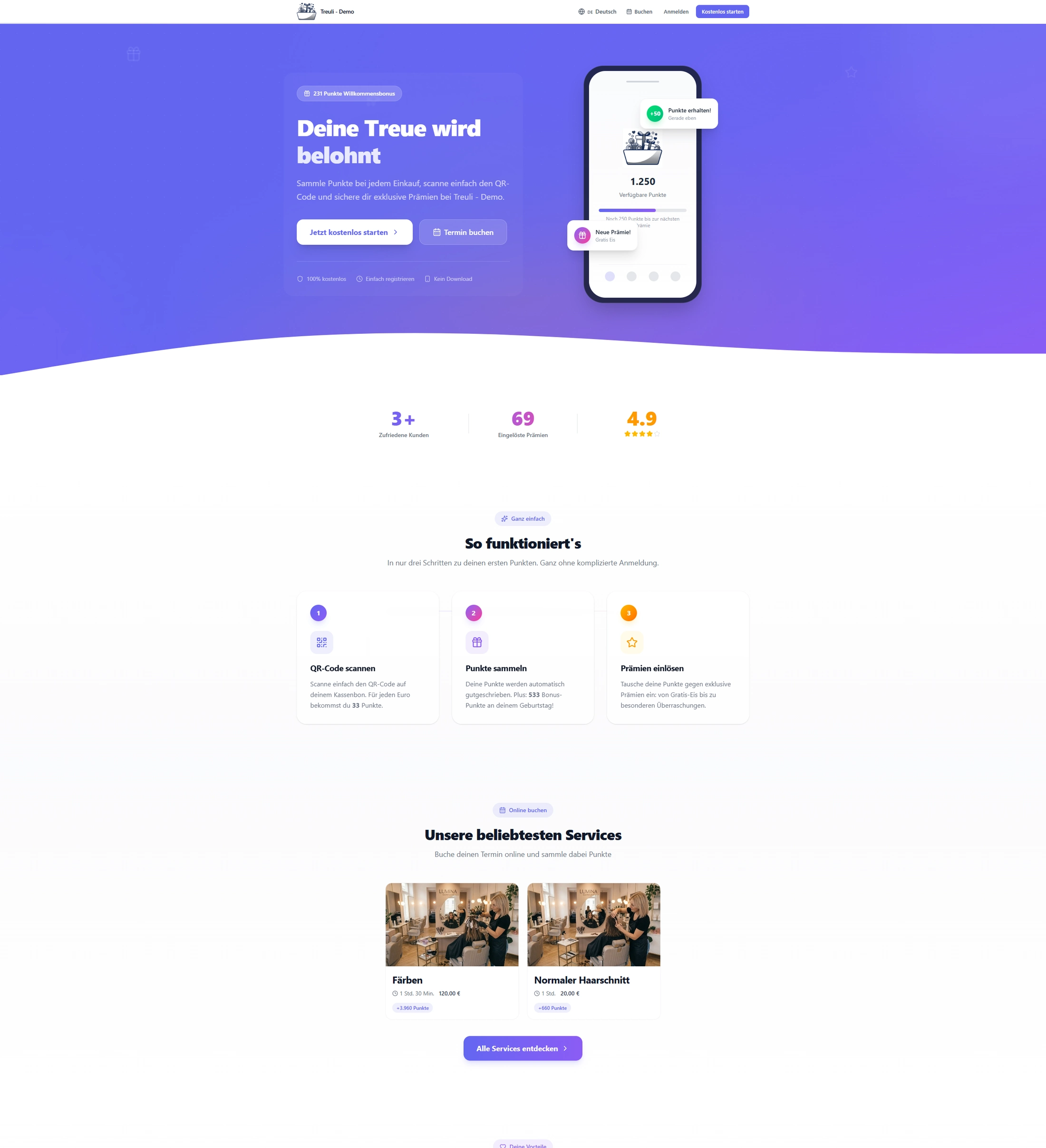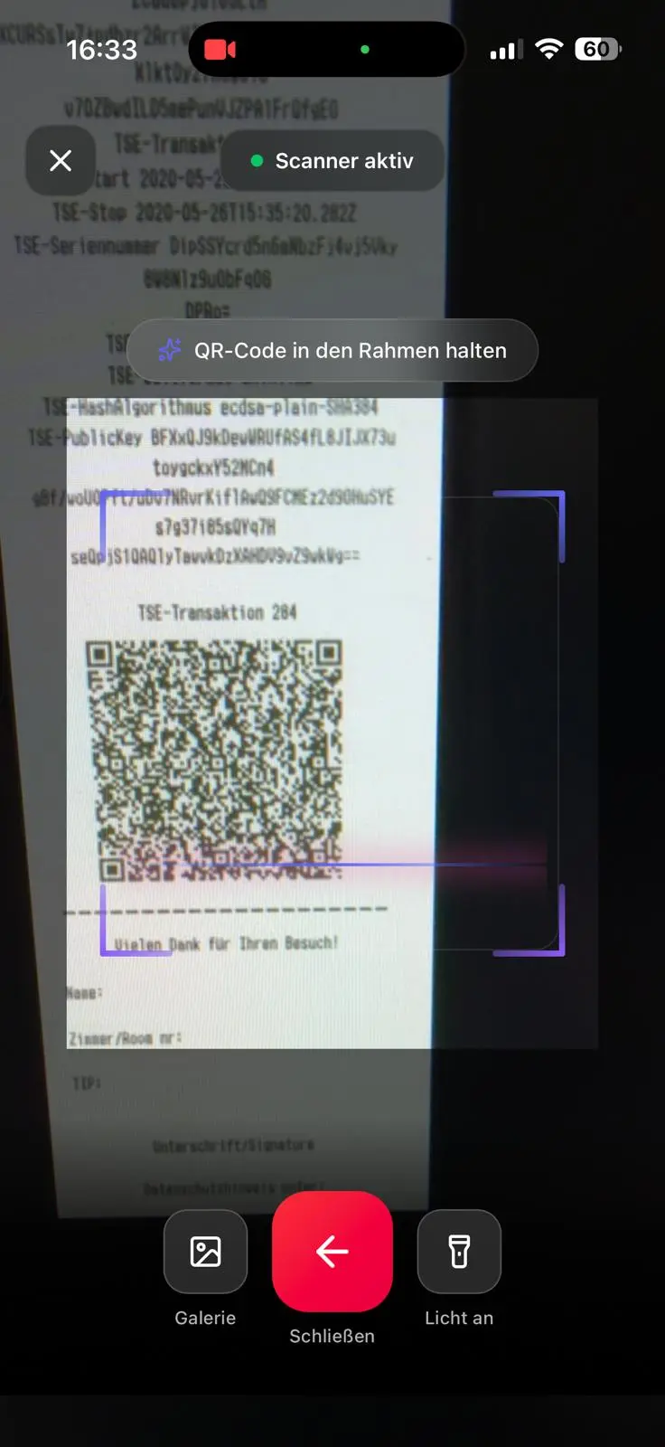 Probar gratis 14 díasLos QR de los tickets ya los imprime tu caja por normativa TSE (Alemania) o RKSV (Austria). Registras tu caja una vez en Treuli, el cliente escanea el ticket y los puntos aparecen en su cuenta. Funciona en el navegador, sin descarga de app.