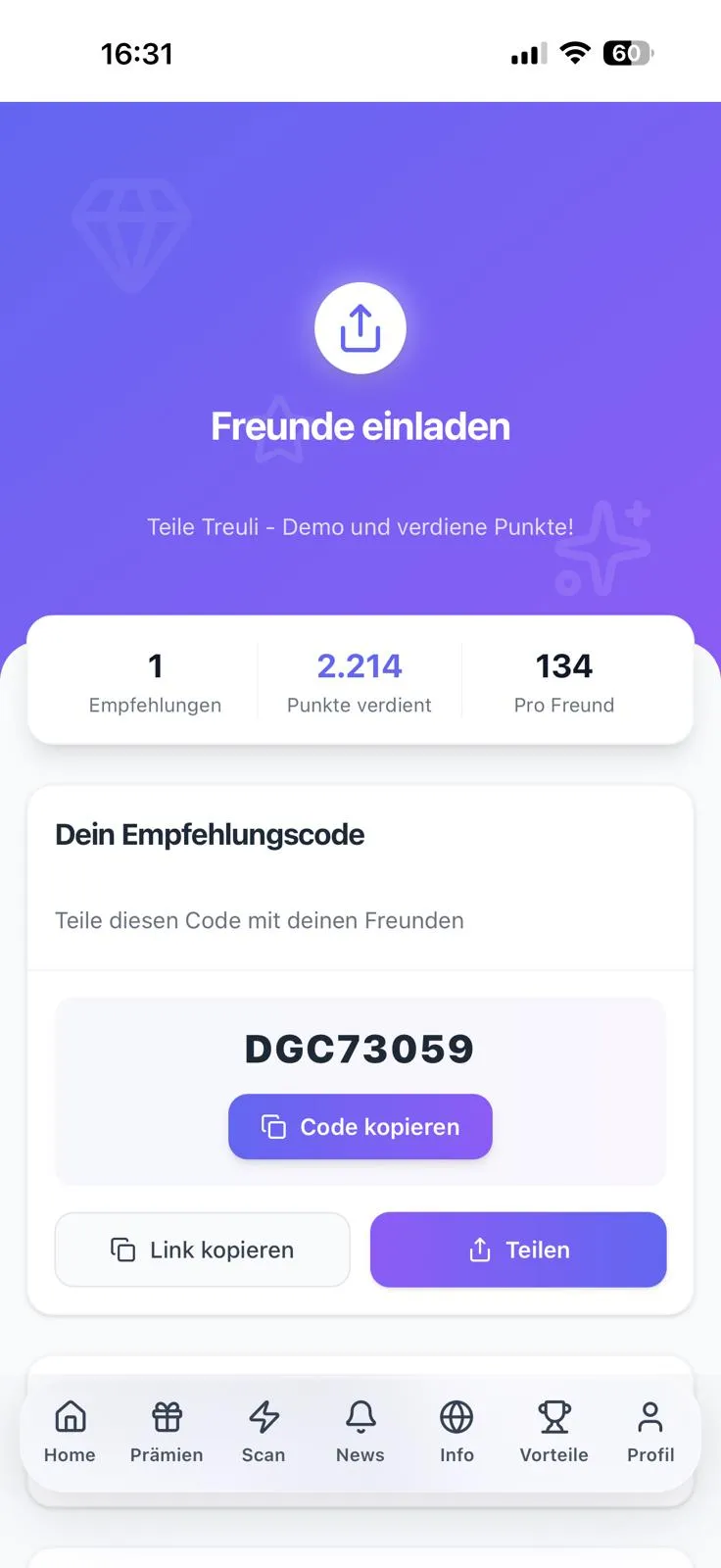 Cada cliente satisfecho tiene su propio enlace de recomendación. Si un amigo se registra a través de él, los dos reciben puntos.