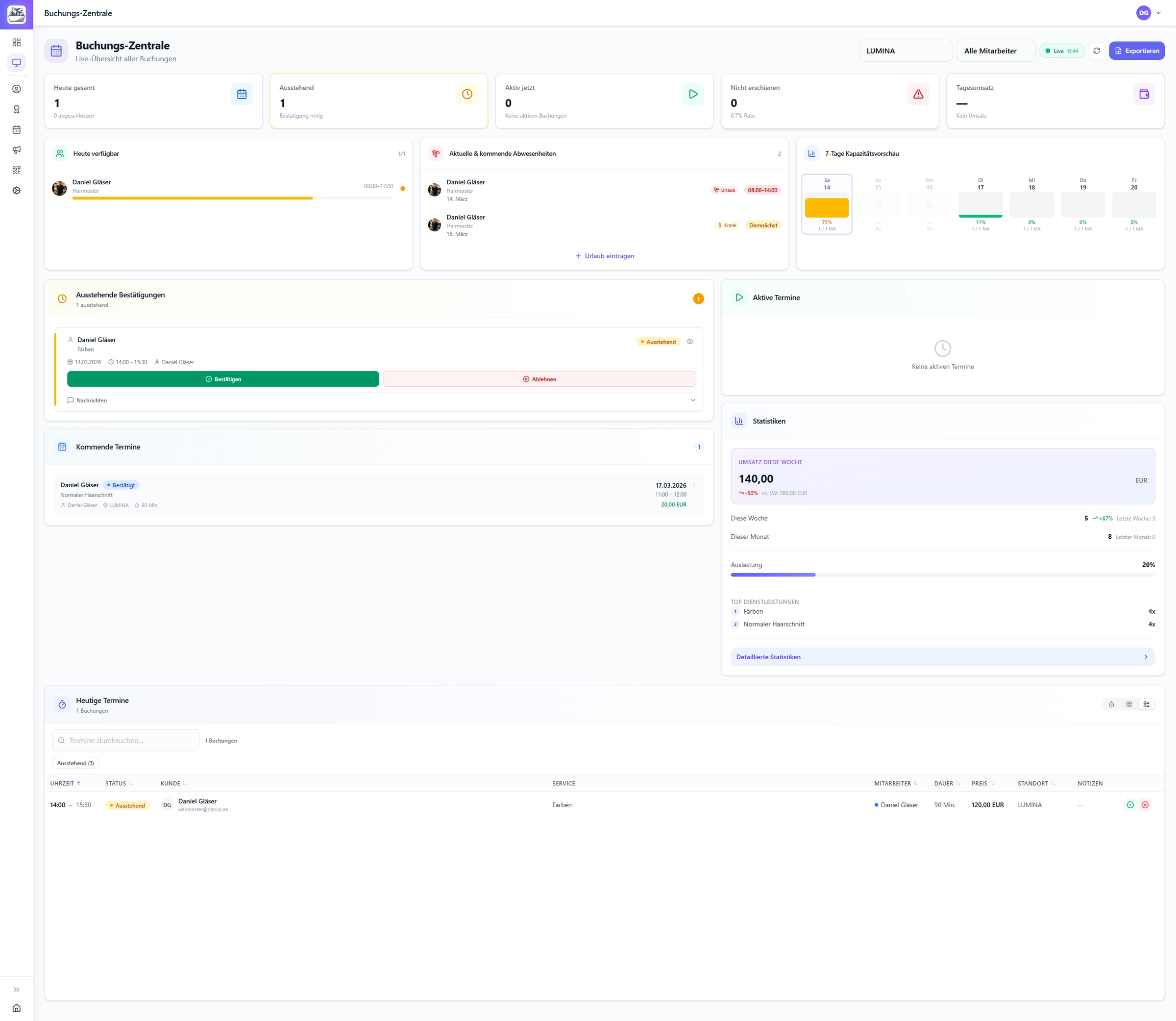 Todas las reservas de un vistazo: qué citas hay hoy, qué confirmaciones siguen pendientes, cómo está la capacidad. Más estadísticas de ingresos y ocupación de empleados.